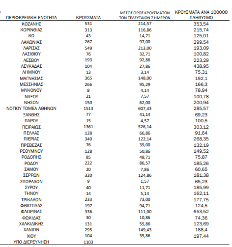 Υπενθυμίζεται πως τα περισσότερα σε αριθμό περιστατικά που είχε καταγράψει ο ΕΟΔΥ μέχρι σήμερα σε μία ημέρα ανακοινώθηκαν χθες, Τρίτη 28 Δεκεμβρίου, όταν εντοπίστηκαν 21.657 περιπτώσεις σε ένα 24ωρο. Επίσης, ο μεγαλύτερος αριθμός θανάτων εξαιτίας του ιού σε ένα 24ωρο καταγράφηκε το Σάββατο 14 Δεκεμβρίου 2021, όταν έχασαν τη ζωή τους 130 ασθενείς.