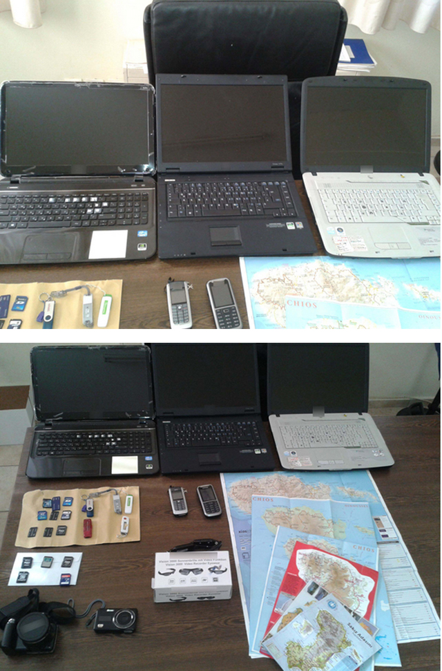 Σε έρευνα που έγινε στην κατοικία του στο νησί, αλλά και στην κατοχή του, βρέθηκαν συνολικά και κατασχέθηκαν τρία laptop, δύο φωτογραφικές μηχανές, 14 κάρτες μνήμης, πέντε usb sticks, πέντε τουριστικοί χάρτες της Χίου, δύο κινητά τηλέφωνα και ένα ζευγάρι γυαλιά με ενσωματωμένη φωτογραφική μηχανή.