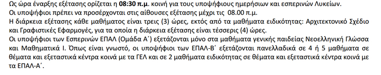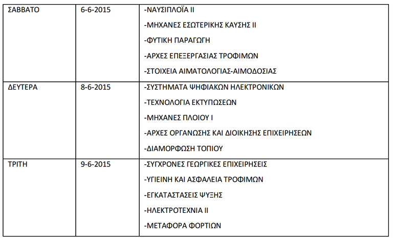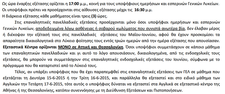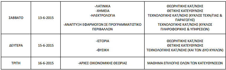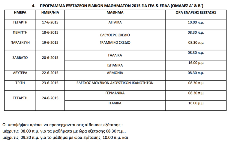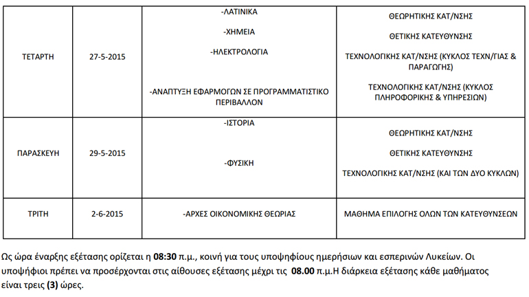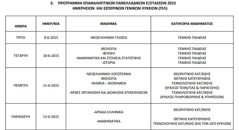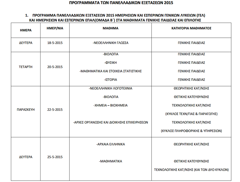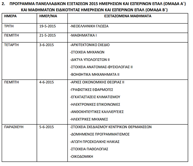Το υπουργείο Παιδείας ανακοίνωσε το πρόγραμμα διεξαγωγής των πανελλαδικών εξετάσεων της Γ΄ τάξης ημερήσιων και της Δ΄ τάξης εσπερινών Γενικών Λυκείων, των πανελλαδικών εξετάσεων της Γ΄ τάξης ημερήσιων και της Δ΄ τάξης εσπερινών ΕΠΑΛ (ΟΜΑΔΑ Β΄) στα μαθήματα γενικής παιδείας και επιλογής, έτους 2015: