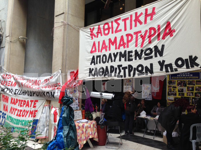 Έξω από το υπουργείο Οικονομικών βρίσκονται οι απολυμένες καθαρίστριες οι οποίες αναμένουν τις επόμενες κινήσεις για την επαναπρόσληψή τους, έπειτα και από τις σχετικές εξαγγελίες εκ μέρους της κυβέρνησης.