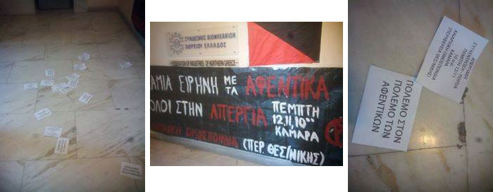 Ο Σύνδεσμος Βιομηχανιών Βορείου Ελλάδος είναι μια από τις βασικές εργοδοτικές ενώσεις που πρωτοστατούν στην ολομέτωπη επίθεση των αφεντικών. Σήμερα, Τρίτη 10/11 καταλάβαμε τα κεντρικά γραφεία του θέλοντας να καταδείξουμε τον ρόλο του και να διακηρύξουμε την ανάγκη συμμετοχής στην γενική απεργία της Πέμπτης ενάντια στην αφήγηση της ταξικής συνεργασίας και της εθνικής ενότητας.