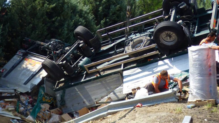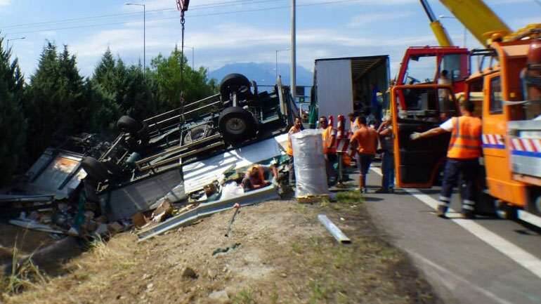 Ανατροπή φορτηγού στην Εθνική Οδό έξω από την Κατερίνη