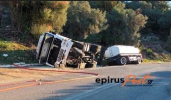 Κομμένη στα δύο παραμένει η Εθνική Οδός Ηγουμενίτσας- Πρέβεζας, μετά το τροχαίο που έγινε την νύχτα με την εκτροπή βυτιοφόρου που μετέφερε καύσιμα.