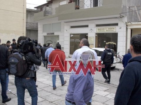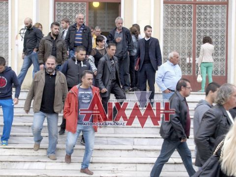 Ο Κ. Μπαρμπαρούσης και οι υπόλοιποι κατηγορούμενοι έφτασαν λίγο πριν από τις 09.00 στο δικαστικό μέγαρο Μεσολογγίου, όπου τους περίμεναν λιγοστοί υποστηρικτές της Χ.Α., προκειμένου να δικαστούν για φθορά ξένης ιδιοκτησίας, πρόκληση παράνομης βίας από κοινού, αλλά και αντιποίηση αρχής, επειδή το Σεπτέμβριο του 2012 κατέστρεψαν πάγκους αλλοδαπών μικροπωλητών στη λαϊκή αγορά του Μεσολογγίου. Μετά την αναβολή που δόθηκε από την έδρα, λόγω της απουσίας του δικηγόρου του κ. Σταθόπουλου, οι κατηγορούμενοι βγήκαν από το δικαστήριο, ενώ κάποιοι εκ των υποστηρικτών φώναξαν συνθήματα, και απομακρύνθηκαν χωρίς περαιτέρω επεισόδια, καθώς υπήρχε και έντονη παρουσία της αστυνομίας.