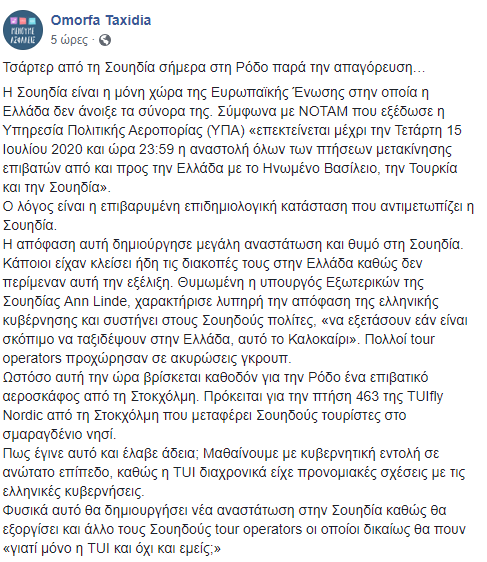 Ο λόγος είναι η επιβαρυμένη επιδημιολογική κατάσταση που αντιμετωπίζει η Σουηδία. Η απόφαση αυτή δημιούργησε μεγάλη αναστάτωση και θυμό στη συγκεκριμένη χώρα. Κάποιοι είχαν κλείσει ήδη τις διακοπές τους στην Ελλάδα καθώς δεν περίμεναν αυτή την εξέλιξη.