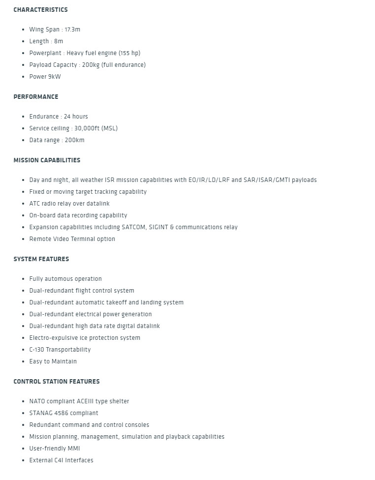 Το νέο μη επανδρωμένο εναέριο σκάφος διαθέτει δύο κινητήρες τουρκικής κατασκευής, έχει αυτονομία 24 ωρών, μέγιστη ταχύτητα 217 χιλιομέτρων ανά ώρα και υψόμετρο πλεύσης 35.000 ποδών.