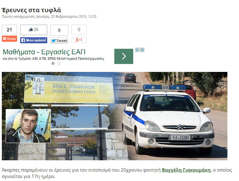 Συνεχίζονται οι έρευνες για τον εντοπισμό του Βαγγέλη Γιακουμάκη, του 20χρονου φοιτητή από τα Ιωάννινα που παραμένει αγνοούμενος για 22η ημέρα