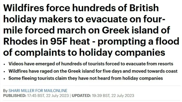 Πρώτη είδηση είναι η φωτιά στη Ρόδο στη βρετανική Daily Mail αναφέροντας ότι «οι πυρκαγιές ανάγκασαν εκατοντάδες Βρετανούς παραθεριστές να εκκενώσουν το νησί περπατώντας αναγκαστικά επί τέσσερα μίλια».