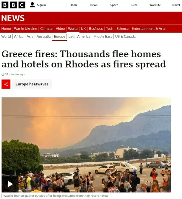 Το βρετανικό δίκτυο BBC έχει επίσης πρώτη είδηση τη φωτιά στη Ρόδο αναφέροντας ότι «χιλιάδες εγκαταλείπουν σπίτια και ξενοδοχεία στη Ρόδο καθώς οι πυρκαγιές εξαπλώνονται».