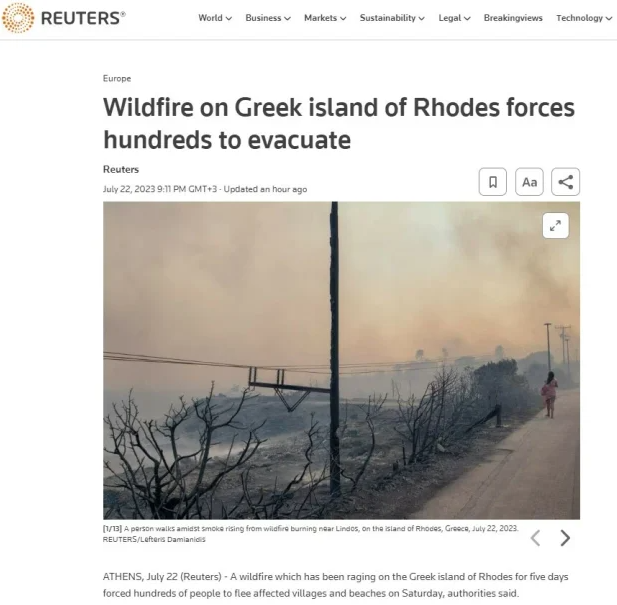 Το πρακτορείο ειδήσεων Reuters σε δημοσίευμά του αναφέρει, μεταξύ άλλων, ότι η φωτιά στη Ρόδο καίει εδώ και πέντε ημέρες.