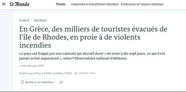 Πρώτη είδηση και στη γαλλική Le Monde είναι η καταστροφική φωτιές στη Ρόδο όπου γίνεται επίσης αναφορά στις απομακρύνσεις χιλιάδων τουριστών από τα πύρινα μέτωπα.