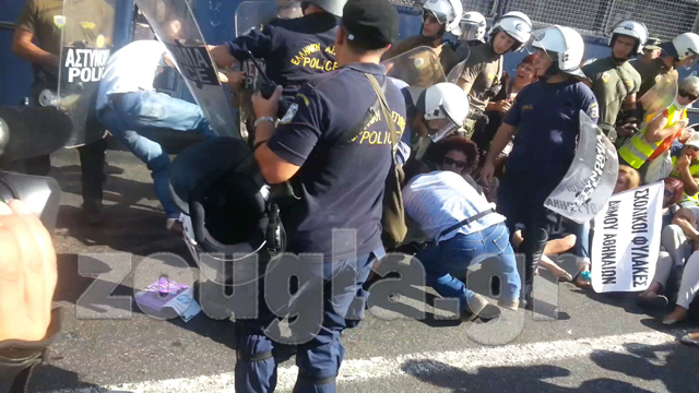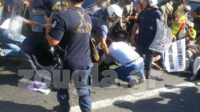 Επεισόδια προκλήθηκαν όταν δυνάμεις των ΜΑΤ επιχείρησαν να απομακρύνουν από τον δρόμο τους συγκεντρωμένους.
