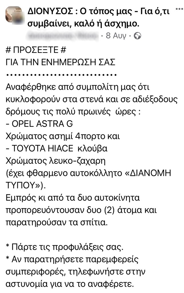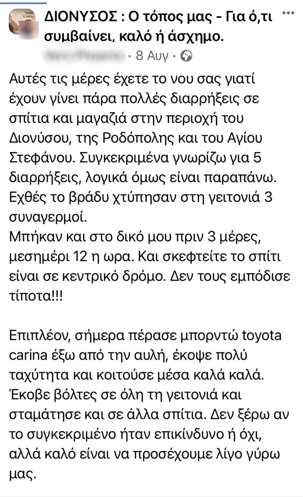 Καθώς η αστυνόμευση είναι ανύπαρκτη και ο Υπουργός Δημόσιας Τάξης, Τάκης Θεοδωρικάκος, ασχολείται μόνο με τις «επιτυχίες» της αστυνομίας σε προβεβλημένες από τα media υποθέσεις, οι κάτοικοι του Δήμου Διονύσου χρησιμοποιούν τα social media για να ενημερώσουν τόσο για τις περιπτώσεις διαρρήξεων σχεδόν καθημερινά, όσο και για να προειδοποιήσουν για την κυκλοφορία ύποπτων οχημάτων στους δρόμους της περιοχής.