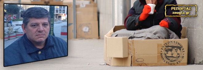 Η τουριστική επιχείρηση στην οποία εργαζόταν απολύει το μεγαλύτερο μέρος του προσωπικού της και με την ανεργία να τριπλασιάζεται σχεδόν μέσα σε διάστημα λίγων μηνών, ο ίδιος στα 52 του καταλήγει άστεγος, να κοιμάται σε παγκάκι της πλατείας Βικτωρίας. «Εκεί ένιωσα ότι τελείωσα», εξομολογείται, αλλά ευτυχώς βρίσκεται μια θέση για αυτόν στο Κέντρο Υποδοχής και Αλληλεγγύης του Δήμου Αθηναίων και έκτοτε διαμένει σε ξενοδοχείο, έχει φαγητό και την ευκαιρία να κάνει μερικά μεροκάματα πουλώντας το περιοδικό των αστέγων «Σχεδία».
