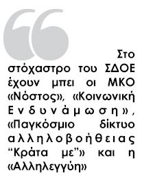Όπως προκύπτει από το ρεπορτάζ, στο στόχαστρο των ελεγκτών του ΣΔΟΕ έχουν μπει οι ΜΚΟ «Νόστος», «Κοινωνική Ενδυνάμωση», «Παγκόσμιο δίκτυο αλληλοβοήθειας “Κράτα με”» και η ΜΚΟ «Αλληλεγγύη» (η οποία σήμερα δεν λειτουργεί).