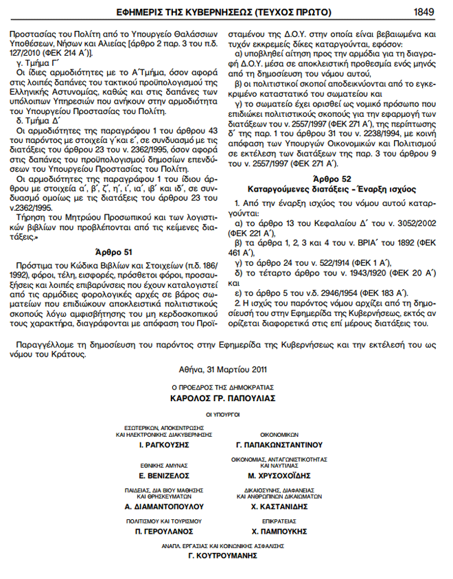 Ο λόγος για τον Νόμο 3943 ο οποίος δημοσιεύθηκε στην Εφημερίδα της Κυβερνήσεως στις 31 Μαρτίου 2011 και «συνοδευόταν» από τις υπογραφές των κ.κ. Κάρολου Παπούλια, Γιάννη Ραγκούση, Ευάγγελου Βενιζέλου, Γιώργου Παπακωνσταντίνου, Μιχάλη Χρυσοχοΐδη, Χρήστου Καστανίδη και άλλων.