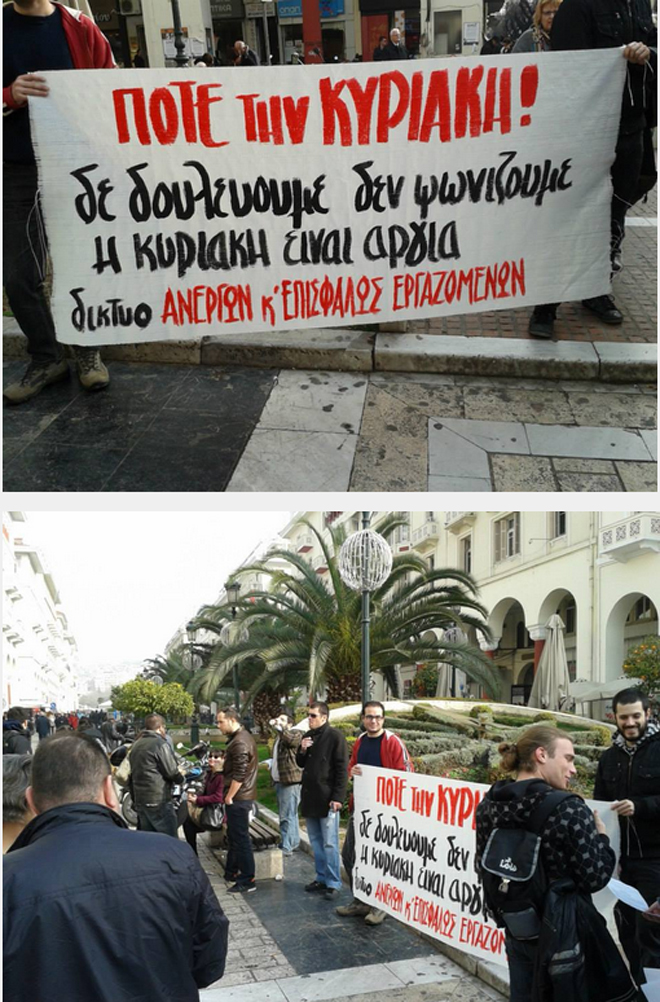 «Δεν δουλεύουμε, δεν ψωνίζουμε. Η Κυριακή είναι αργία» αναγράφει το πανό το οποίο κρατούν τα μέλη του Δικτύου Ανέργων και Επισφαλώς Εργαζομένων στην πλατεία Αριστοτέλους.