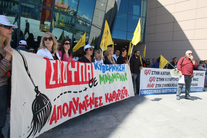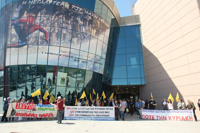 Εν τω μεταξύ 24ωρη απεργία έχει κηρύξει η Ομοσπονδία των Εμποροϋπαλλήλων για σήμερα, ενώ από τις 11.00 το πρωί σε εξέλιξη βρίσκεται συγκέντρωση διαμαρτυρίας στο εμπορικό κέντρο «The Mall Athens» στον σταθμό Νερατζιώτισσα. Με κεντρικό σύνθημα «Ποτέ την Κυριακή» μέλη της Ομοσπονδίας Ιδιωτικών Υπαλλήλων Ελλάδος (ΟΙΥΕ) μαζί με απολυμένες καθαρίστριες εξέφρασαν την αντίθεση τους στην κυριακάτικη λειτουργία των καταστημάτων.
