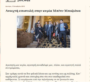 Στη σύζυγο του πρωθυπουργού, την «αγαπητή παλιά συντρόφισσα», όπως λέει, κα Μπέτυ (Περιστέρα) Μπαζιάνα, απευθύνεται σε ανοιχτό γράμμα του ο πανεπιστημιακός Μάνος Στεφανίδης.