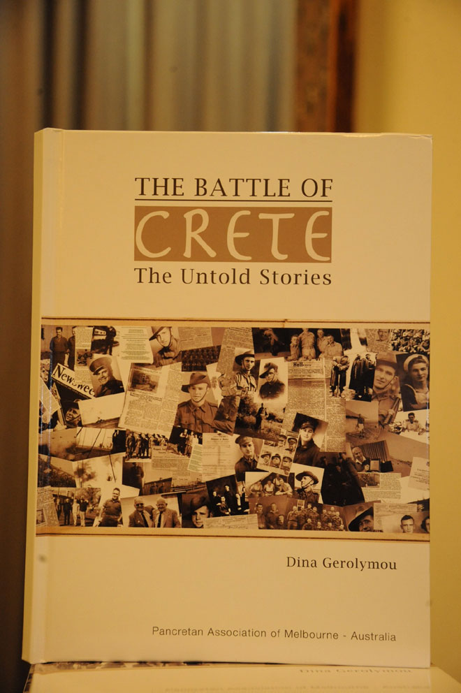 Με την παρουσίαση του βιβλίου «Η Μάχη της Κρήτης – Οι Ανείπωτες Ιστορίες», που έγραψε η δημοσιογράφος και συγγραφέας κα Ντίνα Γερολύμου, ξεκίνησαν στο κατάμεστο ANZAC House της Μελβούρνης, οι εορταστικές εκδηλώσεις για την 73η επέτειο αυτής της ιστορικής μάχης. Αυτό το έργο ορόσημο, όπως το χαρακτήρισε ο Πρόεδρος του Παγκόσμιου Συμβουλίου Κρητών κ. Αντώνης Τσουρδαλάκης, είναι φόρος τιμής για τους στρατιώτες του ANZAC ( του στρατού της Αυστραλίας και της Νέας Ζηλανδίας), που πολέμησαν στο πλευρό των Ελλήνων, εναντίων των Γερμανών. Η «Μάχη της Κρήτης – Ανείπωτες Ιστορίες», εκδόθηκε από την Παγκρήτια Ένωση Μελβούρνης – Αυστραλίας.