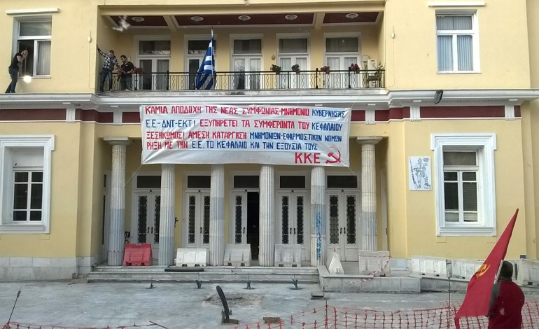 Παρέμβαση του ΚΚΕ με ανάρτηση πανό στην πρόσοψη του δημαρχείου Κοζάνης σημειώθηκε λίγο πριν από τις 07.30 το πρωί.