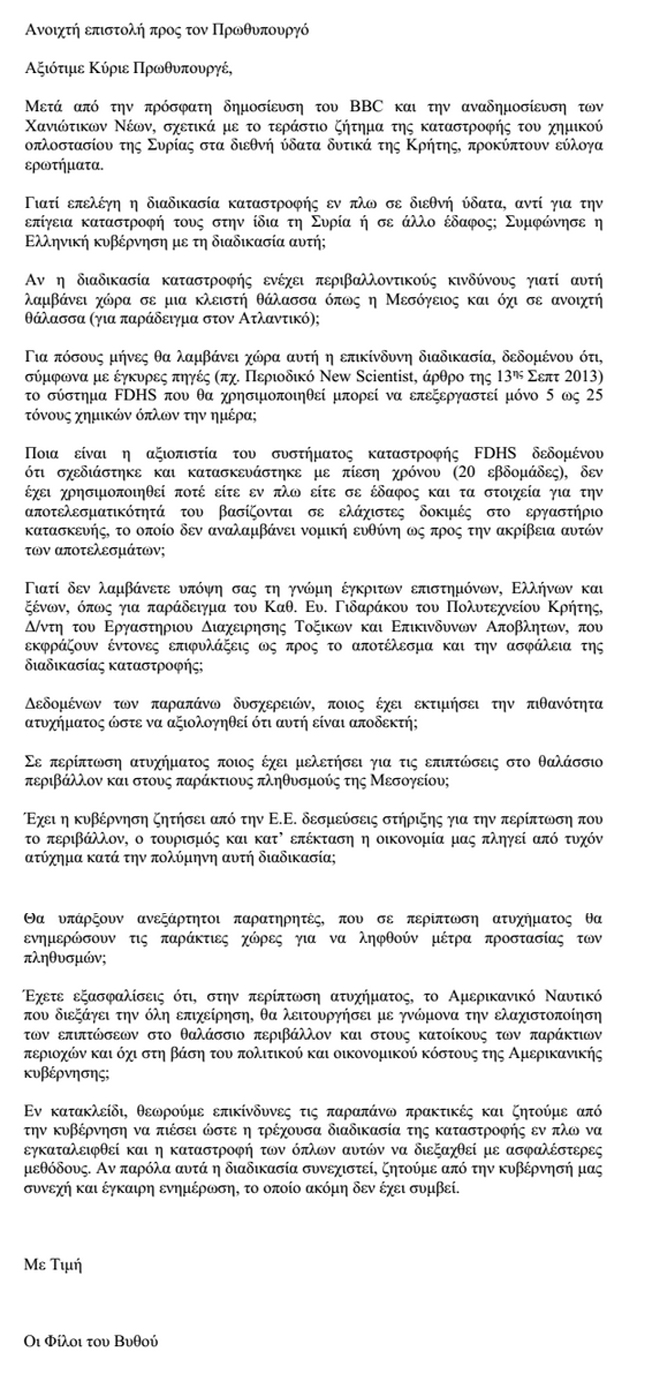 Ο Σύλλογος Χανίων «Φίλοι του Βυθού» απέστειλε ανοικτή επιστολή στον Πρωθυπουργό Aντώνη Σαμαρά σχετικά με το επίκαιρο θέμα της καταστροφής των χημικών όπλων της Συρίας στα διεθνή ύδατα.