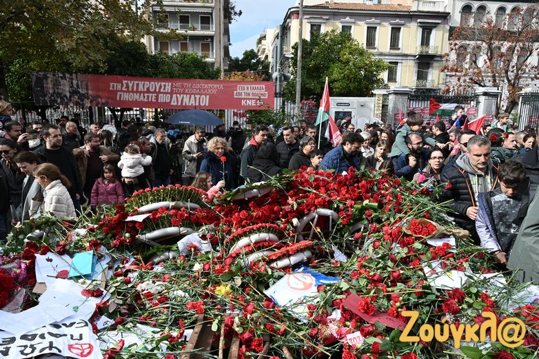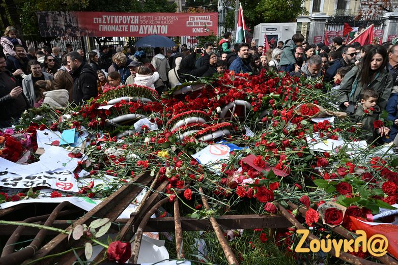 Παρά τη βροχή, πολλές οικογένειες με παιδιά, εκπρόσωποι φορέων και συλλόγων προσέρχονται από το πρωί στο ιστορικό κτιριακό συγκρότημα του Πολυτεχνείου στην Πατησίων, για να αποτίσουν φόρο τιμής στους φοιτητές που εξεγέρθηκαν τα ξημερώματα της 17ης Νοεμβρίου 1973.