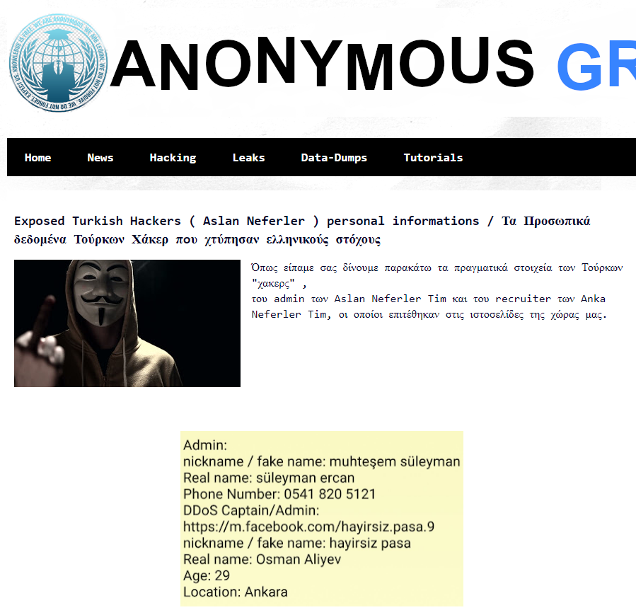 Σε ανακοίνωση που αναρτήθηκε στη σελίδα τους αναφέρουν: «Όπως είπαμε σας δίνουμε παρακάτω τα πραγματικά στοιχεία των Τούρκων “χακερς”,του admin των Aslan Neferler Tim και του recruiter των Anka Neferler Tim, οι οποίοι επιτέθηκαν στις ιστοσελίδες της χώρας μας».