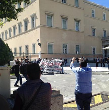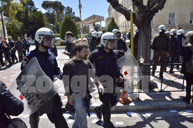 Ομάδα αντιεξουσιαστών που συμμετείχαν στην κατάληψη της Πρυτανείας του Πανεπιστημίου Αθηνών εισέβαλαν το μεσημέρι της Τετάρτης στο προαύλιο της Βουλής, φωνάζοντας συνθήματα.