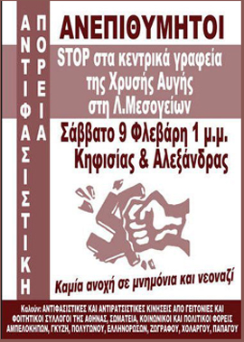 Αντιφατσιστική πορεία θα πραγματοποιηθεί αύριο στη 1 μ.μ. στη συμβολή Κηφισίας και Αλεξάνδρας, ενάντια στο άνοιγμα των νέων γραφείων της Χρυσής Αυγής στη λεωφόρο Μεσογείων.