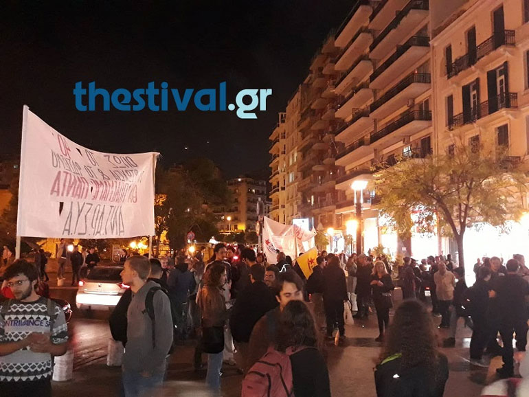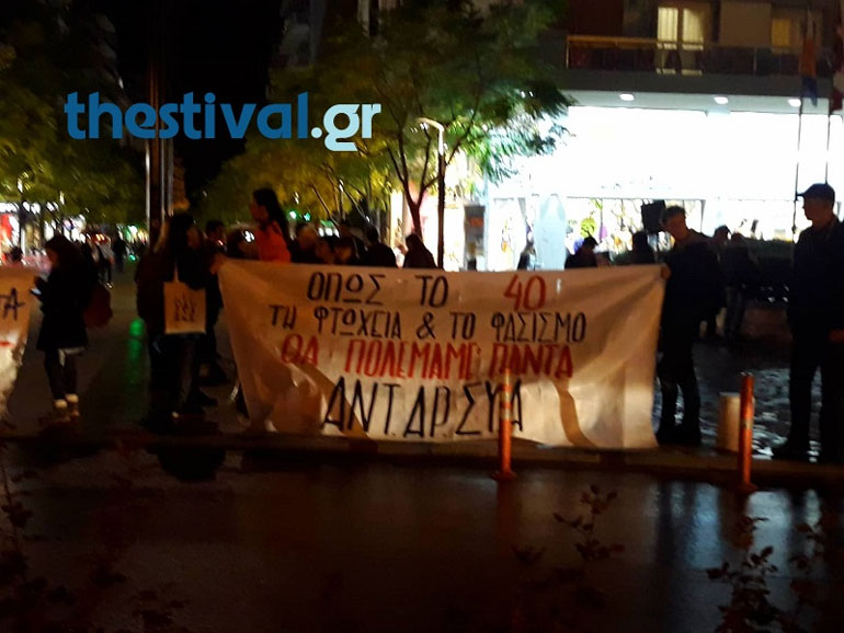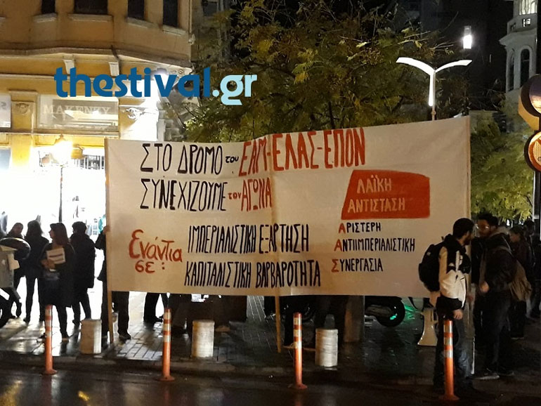 Ειδικότερα, οι συγκεντρωμένοι διαμαρτύρονται στο κέντρο της Θεσσαλονίκης κατά του πολέμου, των μνημονίων αλλά και του φασισμού.