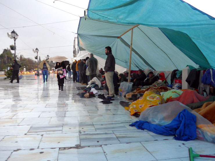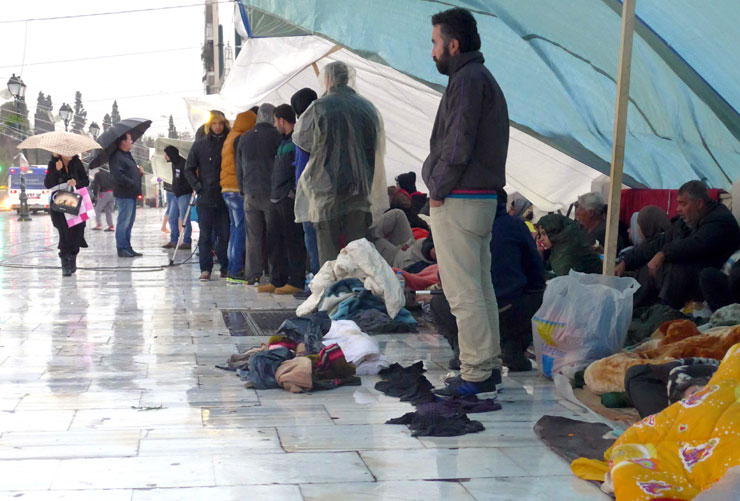 Ακόμα δυσκολότερη κάνει η πρωινή βροχή την παραμονή των Σύρων προσφύγων στην πλατεία Συντάγματος.