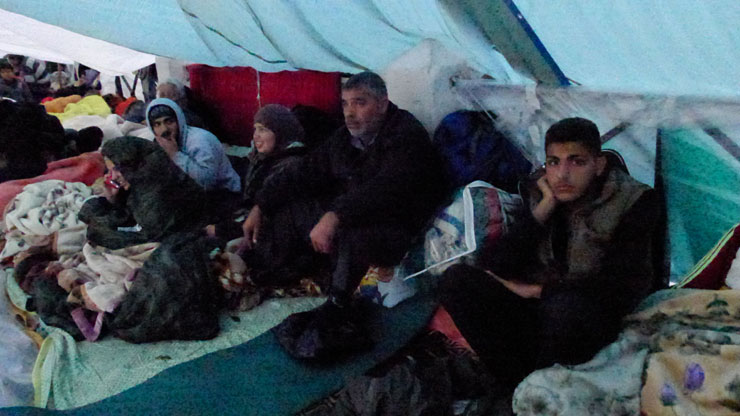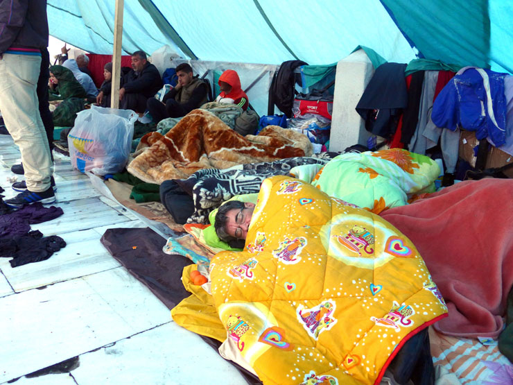 Με πρόχειρες κατασκευές οι πρόσφυγες προσπαθούν να προστατευτούν από την κακοκαιρία, την ίδια στιγμή που η πτώση της θερμοκρασίας ανάγκασε αρκετούς να μπουν κάτω από κουβέρτες.