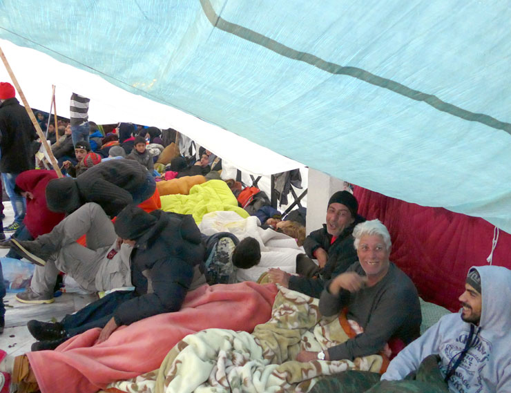 Με πρόχειρες κατασκευές οι πρόσφυγες προσπαθούν να προστατευτούν από την κακοκαιρία, την ίδια στιγμή που η πτώση της θερμοκρασίας ανάγκασε αρκετούς να μπουν κάτω από κουβέρτες.
