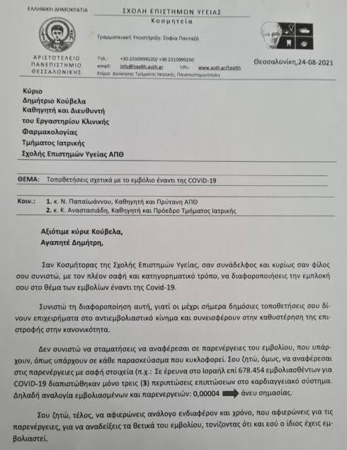 Συγκεκριμένα, o Κοσμήτορας έστειλε πρόσφατα μία γραπτή ενημέρωση προς τον καθηγητή με θέμα: Τοποθετήσεις σχετικά με το εμβόλιο έναντι της Covid-19 και με κοινοποίηση προς τον Πρύτανη του ΑΠΘ και τον πρόεδρο του τμήματος Ιατρικής ΑΠΘ. Μεταξύ άλλων ο κ. Δαρδαβέσης συνιστά στον κ. Κούβελα να διαφοροποιήσει την εμπλοκή του στο θέμα των εμβολίων. Ειδικότερα, λέει μεταξύ άλλων: «Συνιστώ τη διαφοροποίηση αυτή, γιατί οι μέχρι σήμερα δημόσιες τοποθετήσεις σου δίνουν επιχειρήματα στο αντιεμβολιαστικό κίνημα και συνεισφέρουν στην καθυστέρηση της επιστροφής στην κανονικότητα….».