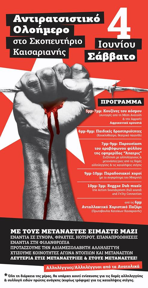 Πιστεύουμε ότι οι δράσεις αδιαμεσολάβητης αλληλεγγύης με τις μετανάστριες και τους μετανάστες πρέπει να ενδυναμωθούν στις γειτονιές μας ακόμα περισσότερο. Στην κατεύθυνση αυτή πήραμε την πρωτοβουλία διοργάνωσης ενός αντιρατσιστικού ολόημερου το Σάββατο 4 Ιούνη στο Σκοπευτήριο της Καισαριανής με στόχο την όσο το δυνατόν εντονότερη εμπλοκή των ίδιων των μεταναστ(ρι)ών/προσφύγων, προσπαθώντας να δυναμώσουμε και να βαθύνουμε τις σχέσεις μας μαζί τους».
