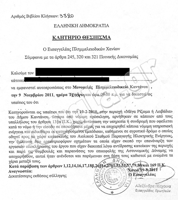 Σύμφωνα με το κλητήριο θέσπισμα, «…οι κατηγορούμενοι εμπόδισαν, καθήμενοι σε αγροτικό δρόμο ο οποίος οδηγεί προς το χώρο κατασκευής του Αιολικού Σταθμού Παραγωγής Ηλεκτρικής Ενέργειας, τη διέλευση δύο ερπιστριοφόρων οχημάτων τα οποία είχαν σκοπό την επανέναρξη των εργασιών ολοκλήρωσης του έργου…και παρά τις συμβουλές και παραινέσεις του επικεφαλής της Αστυνομικής Δύναμης να αποχωρήσουν, αυτοί ήταν ανένδοτοι και παρέμειναν στη θέση τους καθιστοί με ενωμένα τα χέρια μεταξύ τους.»
