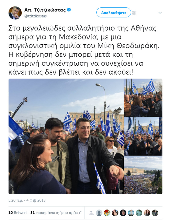 Αναλυτικά, ο κ.Τζιτζικώστας έγραψε: «Στο μεγαλειώδες συλλαλητήριο της Αθήνας σήμερα για τη Μακεδονία, με μία συγκλονιστική ομιλία του Μίκη Θεοδωράκη. Η κυβέρνηση δεν μπορεί μετά και τη σημερινή συγκέντρωση να συνεχίσει να κάνει πως δεν βλέπει και δεν ακούει!».