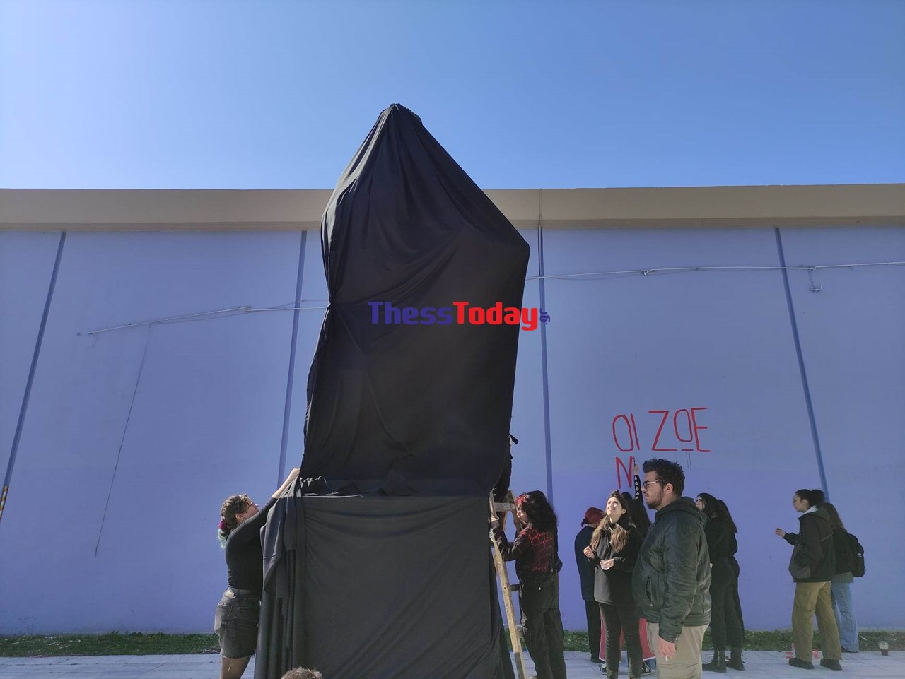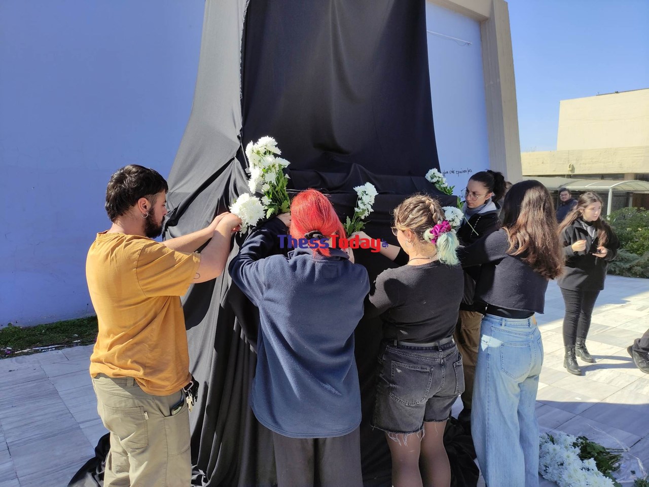Με μαύρο πανί και λευκά λουλούδια σκέπασαν το άγαλμα του Αριστοτέλη έξω από την πρυτανεία του Αριστοτελείου Πανεπιστημίου Θεσσαλονίκης φοιτητές και μέλη φοιτητικών συλλόγων, σε ένδειξη πένθους για τους νεκρούς συμφοιτητές τους που έχασαν τη ζωή τους στη μοιραία αμαξοστοιχία στα Τέμπη.