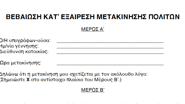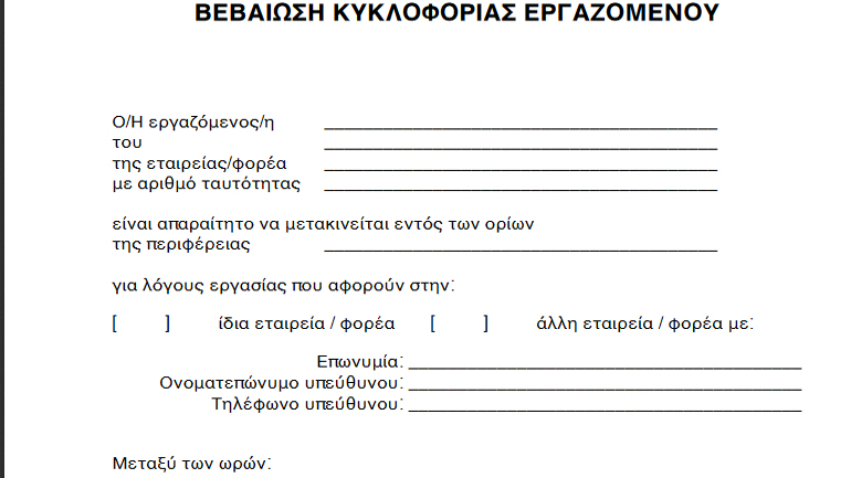 Δείτε ΕΔΩ τη βεβαίωση που θα πρέπει να κατεβάσουν και να συμπληρώσουν όσοι πρέπει να μετακινηθούν στην εργασία τους