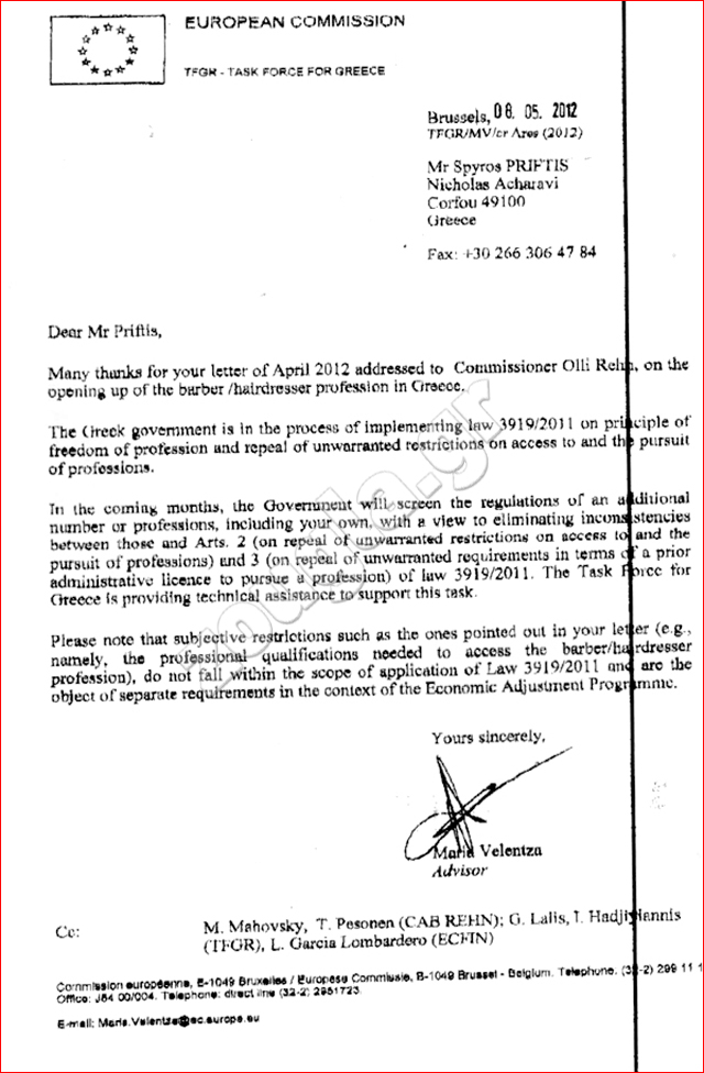 Ο επίτροπος απάντησε στον κ. Πρίφτη στις 8 Μαΐου (σ.σ. η απάντηση έφτασε σήμερα, 24 Μαΐου) στα χέρια του κουρέα από την Κέρκυρα. Στην επιστολή, αναφέρεται πως «η ελληνική κυβέρνηση είναι στη διαδικασία εφαρμογής του νόμου 3919/2011 για την απελευθέρωση του επαγγέλματος και την άρση των περιορισμών στην εισαγωγή και εξάσκηση επαγγέλματος».