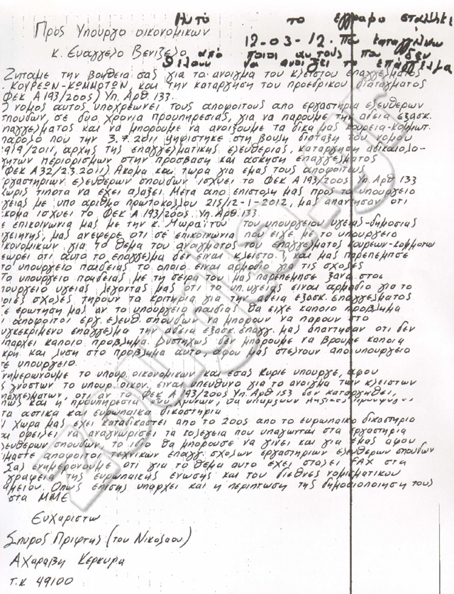 Η επιστολή του κ. Πρίφτη στον κ. Βενιζέλο
