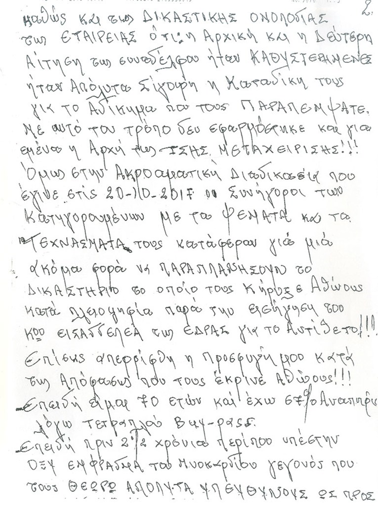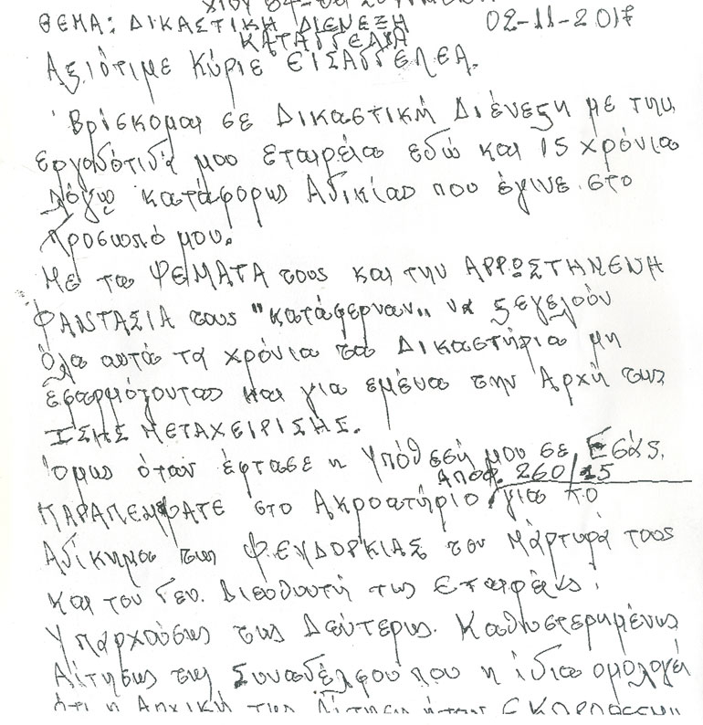 Στην επιστολή του προς τον εισαγγελέα ο 70χρονος κάνει λόγο για παραπλάνηση της δικαιοσύνης και τον καλεί να επανεξετάσει την υπόθεση. «Ζητώ την άμεση παρέμβαση του Εισαγγελέα του Αρείου Πάγου προκειμένου να σταματήσει η άνιση, άδικη και απάνθρωπη συμπεριφορά της εταιρείας στο πρόσωπό, αλλά κυρίως να προστατευτεί η δικαιοσύνη και το κύρος της από τις λάθος αποφάσεις που έχει οδηγηθεί», αναφέρει χαρακτηριστικά.
