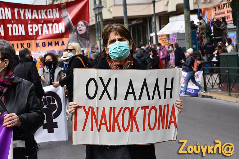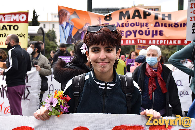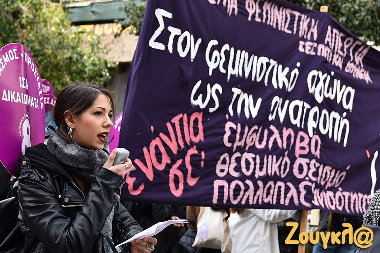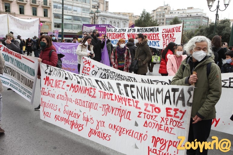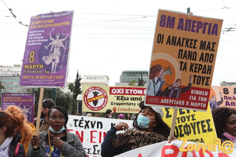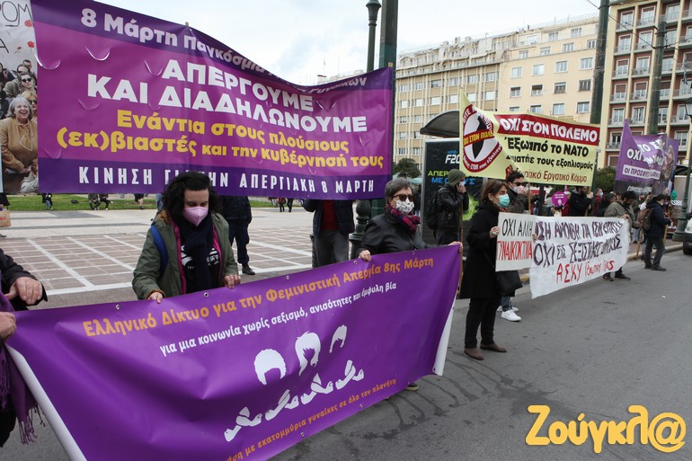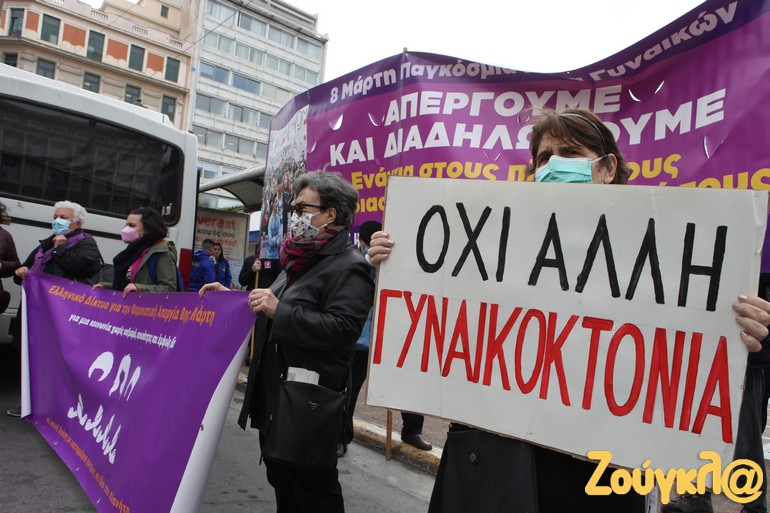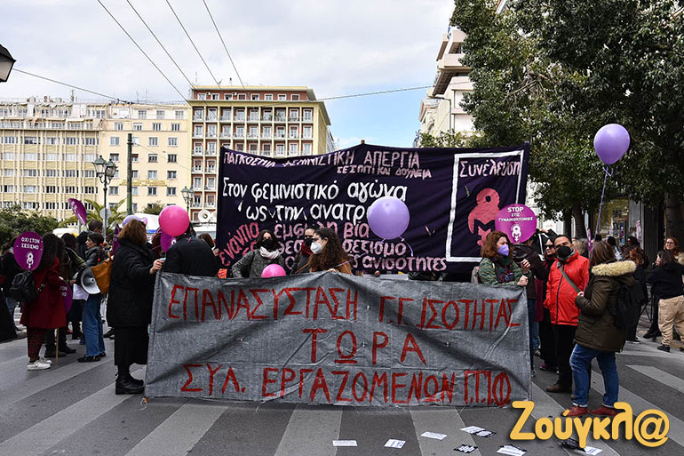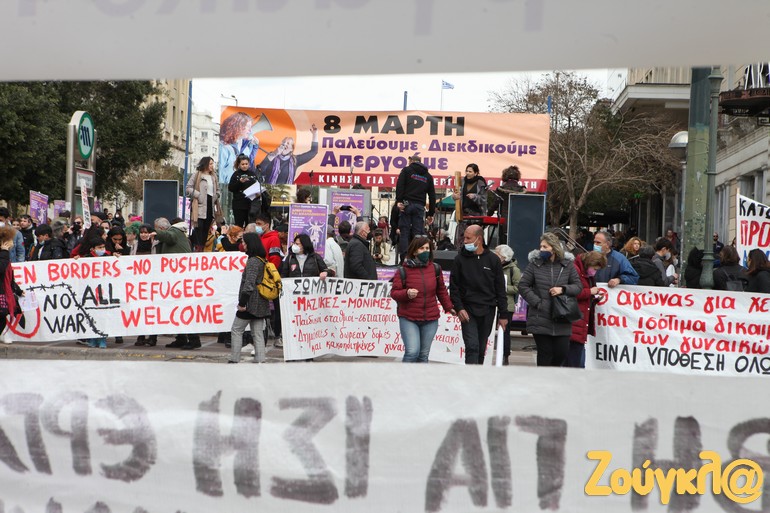 Συγκέντρωση στην πλατεία Κλαυθμώνος και πορεία μέχρι τη Βουλή, που ολοκληρώθηκε γύρω στις 15.00, πραγματοποιήθηκε για την 8η Μάρτη, Παγκόσμια Ημέρα των Γυναικών.