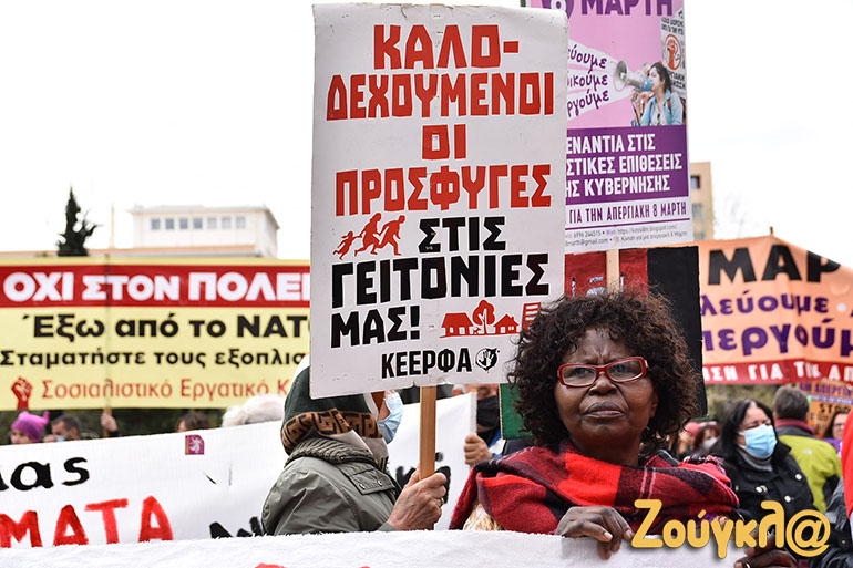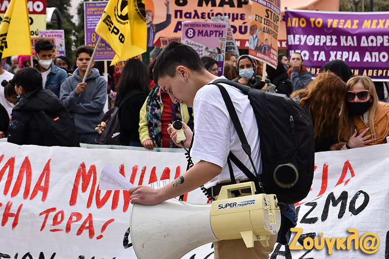 «Ποτέ καμία μόνη», «τι κάνω με το σώμα μου δεν αφορά κανέναν», «ίση αμοιβή για ίση εργασία», «ακόμα και αν φορέσω τη φούστα μου καπέλο, όταν λέω όχι σημαίνει ότι δεν θέλω» ήταν μεταξύ των συνθημάτων που ακούστηκαν στην συγκέντρωση μαζί με πολλά αντιπολεμικά μηνύματα, ενώ το κεντρικό πανό ζητούσε την «Επανασύσταση γενικής γραμματείας ισότητας».