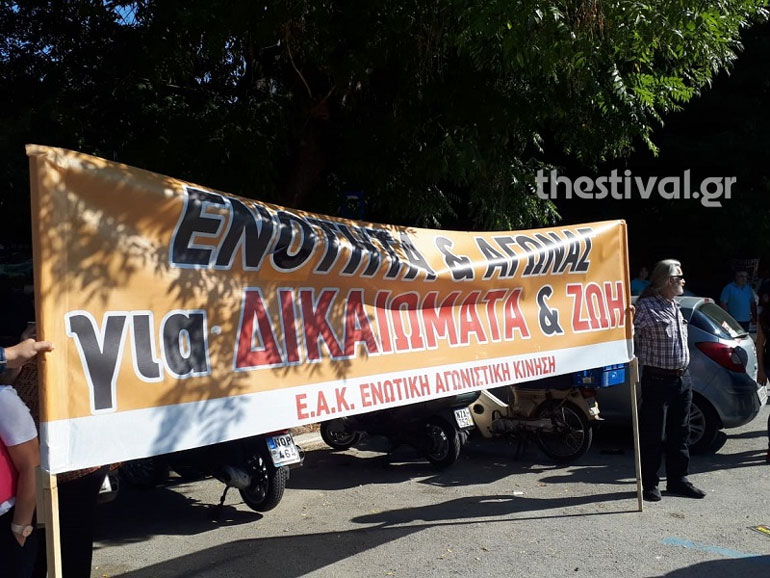 Συγκέντρωση, στο πλαίσιο της 24ωρης απεργίας που έχει προκηρύξει για σήμερα η ΓΣΕΕ, πραγματοποιούν μέλη του Εργατοϋπαλληλικού Κέντρου Θεσσαλονίκης μπροστά από το κτήριο του ΕΚΘ, στην οδό Ολύμπου.