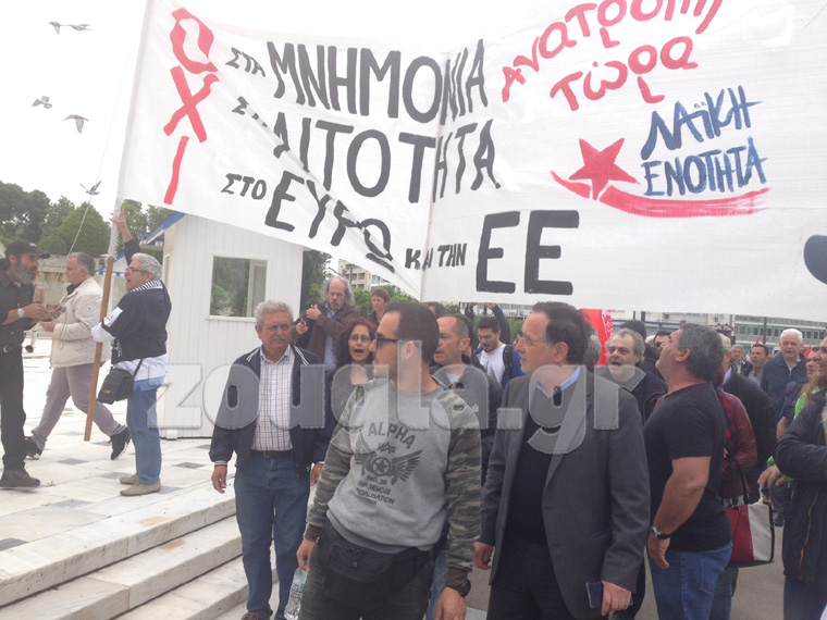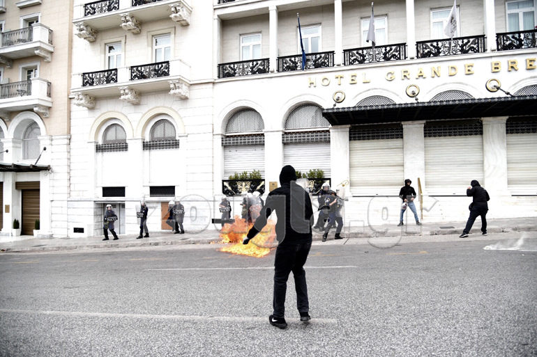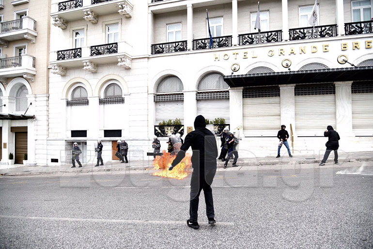 Ένταση επικράτησε νωρίς το μεσημέρι έξω από το ξενοδοχείο «Μ. Βρετανία» μεταξύ αστυνομικών και διαδηλωτών.