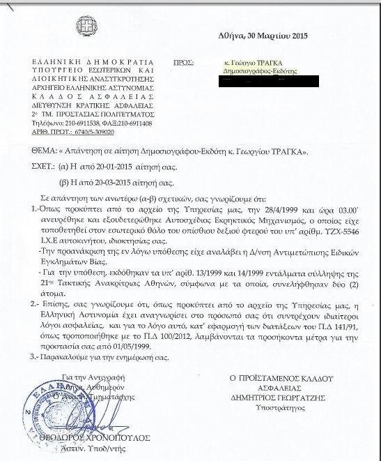 Αξίζει να σημειωθεί ότι η Ελληνική Αστυνομία έχει κοινοποιήσει απόρρητο έγγραφο επί εποχής ΣΥΡΙΖΑ στον Γιώργο Τράγκα ότι συντρέχουν στο πρόσωπο του ιδιαίτερα μέτρα ασφαλείας.