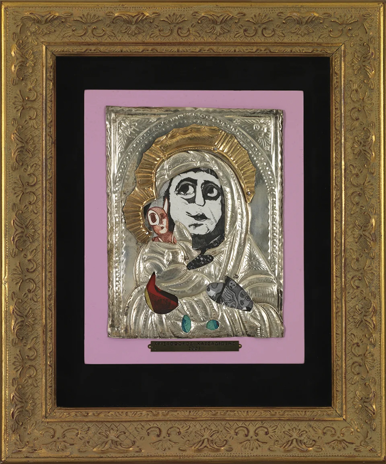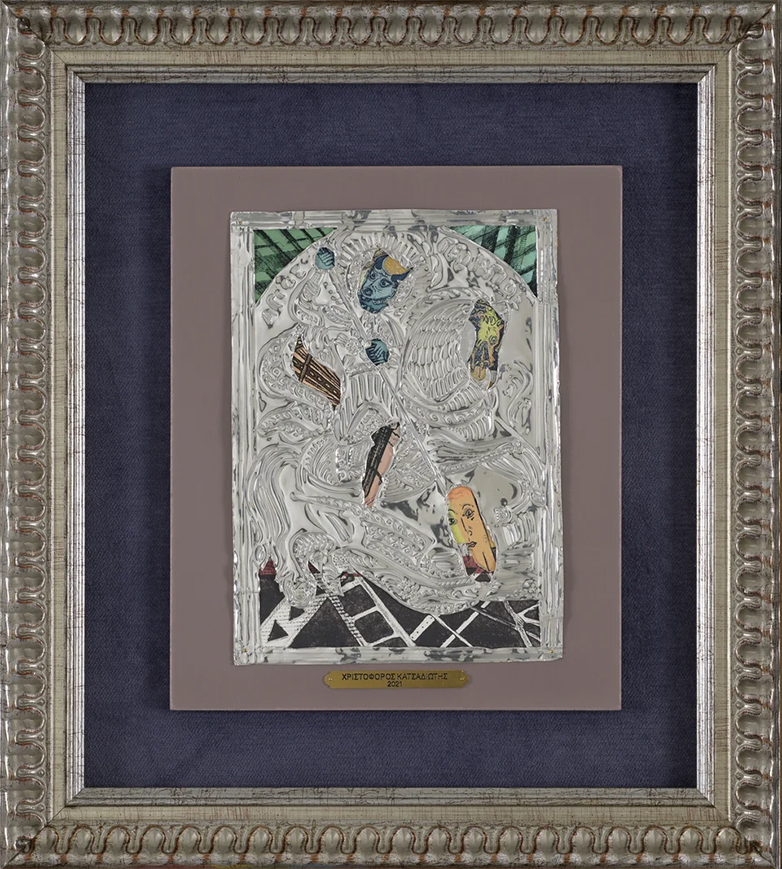 Χριστόφορος Κατσαδιώτης (1971) Εικόνισμα 1ο, 2021, Οξυγραφία, ραφή με κλωστή, μέταλλο, 48,5 x 43,3 εκ.