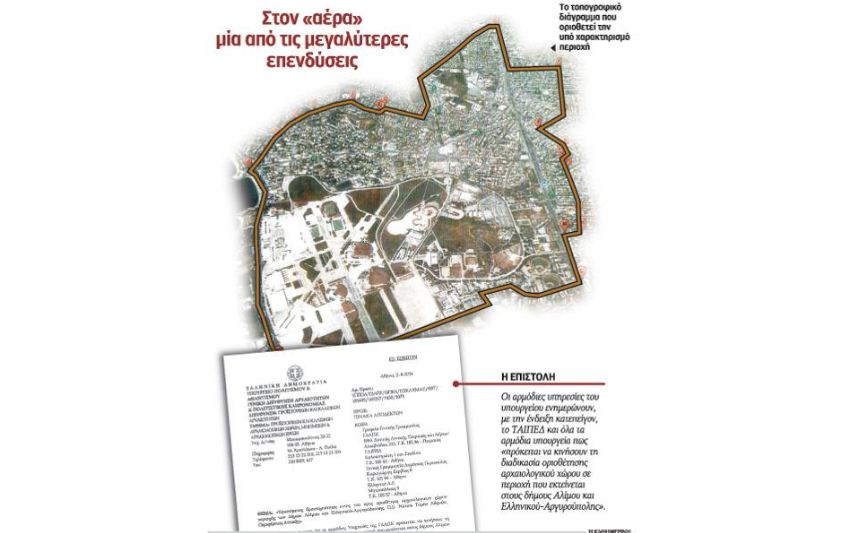 Όπως γράφει η «Καθημερινή», παρά τις δεσμεύσεις της κυβέρνησης ότι θα τηρήσει τη μνημονιακή υποχρέωση που έχει καταληκτική ημερομηνία τη 16η Νοεμβρίου, σύμφωνα με επιστολή της Γενικής Διεύθυνσης Αρχαιοτήτων και Πολιτιστικής Κληρονομιάς του υπουργείου, με την ένδειξη εξαιρετικά επείγουσα η οποία απευθύνεται προς όλα τα αρμόδια υπουργεία και κοινοποιείται μεταξύ άλλων και στο ΤΑΙΠΕΔ, τη Γενική Γραμματεία Δημόσιας Περιουσίας και την υπό παραχώρηση Ελληνικό Α.Ε., οι αρμόδιες υπηρεσίες του υπουργείου ενημερώνουν πως «πρόκειται να κινήσουν τη διαδικασία οριοθέτησης αρχαιολογικού χώρου σε περιοχή που εκτείνεται στους Δήμους Αλίμου και Ελληνικού – Αργυρούπολης».